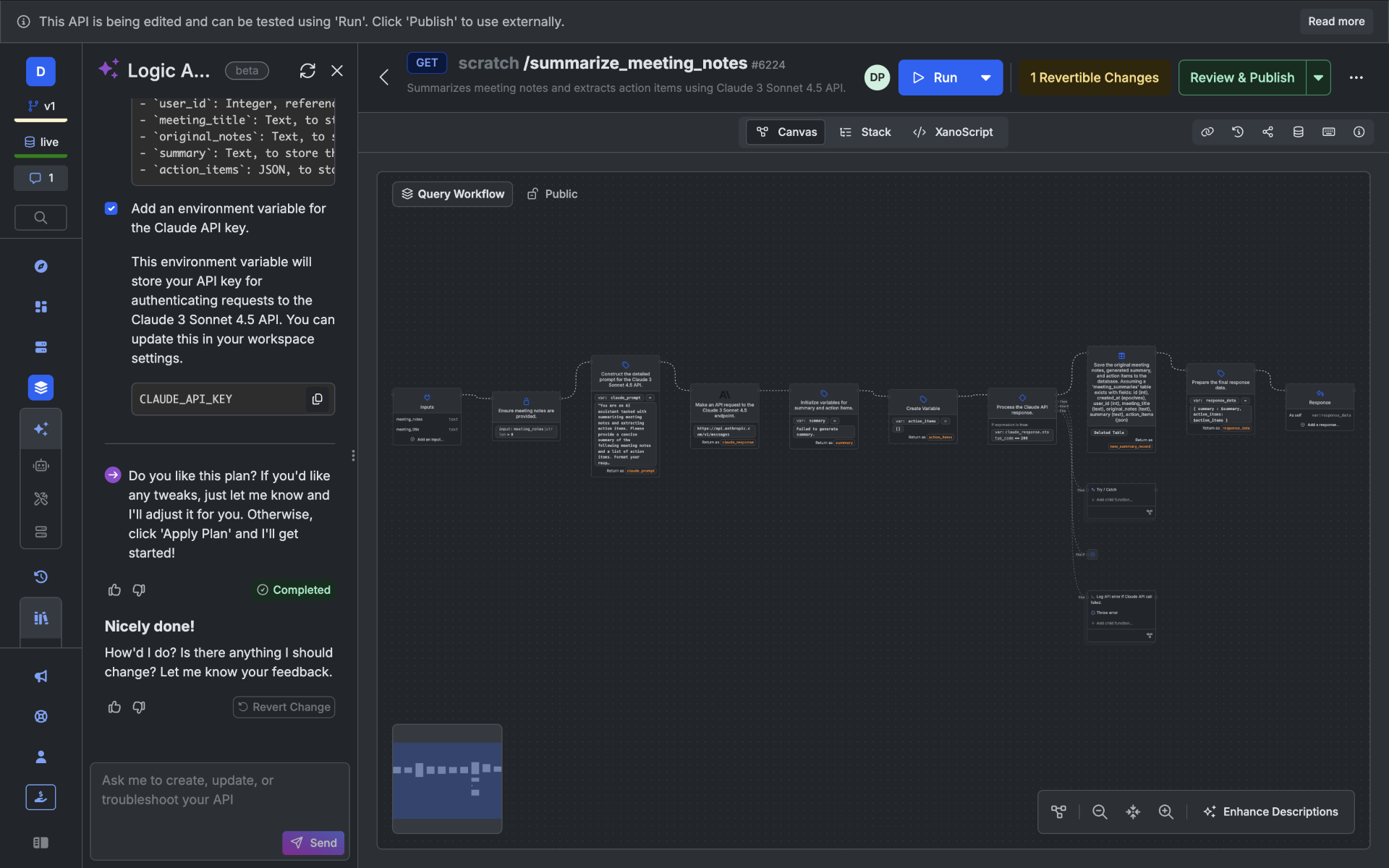 For a second example, imagine you’re building AI features into a SaaS product. In this case, your prompt might be something like ‘Create an API endpoint that takes meeting notes, summarizes them using the latest Claude model, and returns key action items.’ When given this prompt, the Logic Assistant doesn’t just build it. First, it explains the details of how it’s going to build it: defining the API endpoint and inputs, constructing the Claude prompt, calling the Claude API, parsing the API responses, storing the meeting notes and summaries, and returning action items. It also shows you any dependencies that would be required for the process to work (like the need to create specific tables or environment variables, which it can also make suggestions to help you do). And then, before actually executing anything, it asks you if you’d like to make any tweaks before accepting the plan.